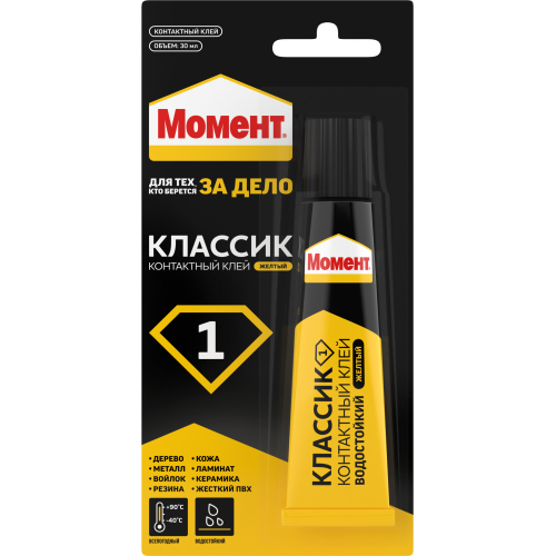 Клей Момент-1 422971 является водостойким и предназначен для склеивания в различных сочетаниях дерева, металла, кожи, резины, войлока, декоративно-слоистых пластиков, стекла, керамики, фарфора. Основа - синтетический каучук. Клеевой шов получается очень надежным. Нельзя использовать для посуды, контактирующей с пищей. Необходимо хранить при температуре о -20ºС до +30ºС. Если клей замерз, то свои свойства он восстановит при комнатной температуре. Поставляется на блистере. Срок годности — 24 месяца.