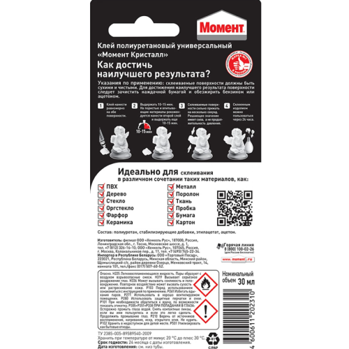 Универсальный прозрачный полиуретановый клей, идеален для склеивания поверхностей из различных материалов в разных комбинациях. Момент прозрачный не оставляет заметных следов. Лучше всего подходит для работы с чистыми поверхностями или с цветными материалами. Универсальный прозрачный полиуретановый клей. Прозрачный. Надежный. Водостойкий и морозостойкий. Можно склеивать дерево, металл, резину, бумагу, картон, кожу, ткань, пробку, поролон, фарфор, керамику, стекло. Шов получается высокопрочным и водостойким. Нельзя использовать для посуды, контактирующей с пищей. Необходимо хранить при температуре о -20ºС до +30ºС. Если клей замерз, то свои свойства он восстановит при комнатной температуре. Поставляется на блистере. Срок годности - 24 месяца.