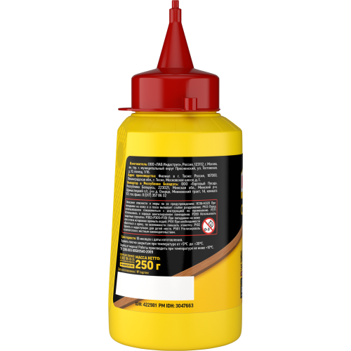 Поверхности должны быть сухими и чистыми. Перед склеиванием выдержите материалы при комнатной температуре. --- Нанесите клей на одну из поверхностей тонким ровным слоем. Соедините поверхности и прижмите их друг к другу на 15-20 минут. При склеивании температура окружающей среды не должна быть ниже чем +6С. Склеенные детали можно обрабатывать через 24 часа. --- Удаление остатков клея с инструментов и материалов производится с помощью воды. Засохший клей удаляется механическим способом. --- Хранить герметичным при температуре от плюс 5°C до плюс 30°C. По истечении срока годности высохшие остатки утилизировать как бытовой отход.