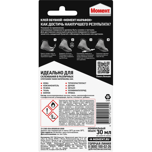 Клей предназначен для склеивания обуви и обувных материалов в различных сочетаниях из резины, термоэластопласта, кожи, кожзаменителей, ткани, войлока, пробки, пластика. Основные свойства: отлично склеивает дерево, металл, поливинилхлорид и другие материалы. Высокая эластичность шва. Водостойкий. Морозостойкий. Надёжная прочность склеивания. Эластичен и устойчив к внешним воздействиям и агрессивной окружающей среде. Не пригоден для склеивания стиропора, полиэтилена, полипропилена, пластифицированного ПВХ.