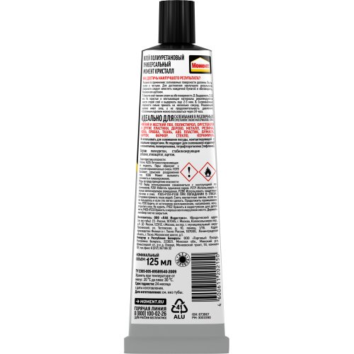 Универсальный прозрачный полиуретановый клей, идеален для склеивания поверхностей из различных материалов в разных комбинациях. Момент прозрачный не оставляет заметных следов. Лучше всего подходит для работы с чистыми поверхностями или с цветными материалами. Универсальный прозрачный полиуретановый клей. Прозрачный. Надежный. Водостойкий и морозостойкий. Можно склеивать дерево, металл, резину, бумагу, картон, кожу, ткань, пробку, поролон, фарфор, керамику, стекло. Шов получается высокопрочным и водостойким. Нельзя использовать для посуды, контактирующей с пищей. Необходимо хранить при температуре о -20ºС до +30ºС. Если клей замерз, то свои свойства он восстановит при комнатной температуре. Поставляется на блистере. Срок годности - 24 месяца.