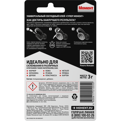 Склеиваемые поверхности должны быть сухими и чистыми. Чтобы увеличить прочность склеивания поверхности рекомендуется дополнительно зачистить наждачной бумагой и обезжирить бензином или ацетоном --- Нанести клей на одну из поверхностей и сразу прижать детали друг к другу. Прижимайте от центра к краям, чтобы избежать скопления воздуха. Тщательно приклеивайте края. Время фиксации обычно составляет 5-60 секунд. Приблизительно 50% прочности склеивания достигается примерно через 5 минут, а окончательная прочность склеивания в пределах 100-200 кг/см2 (усилие разрыва) достигается от 12 до 24 часов. --- Используйте средство для удаления клея «Супер Момент Антиклей» --- Хранить плотно закрытым при температуре от минус 20°C до плюс 30°C. Идеальные условия хранения от плюс 2°C до плюс 8°C. В случае замораживания клей полностью восстанавливает свою первоначальную консистенцию и свойства при комнатной температуре. По истечении срока годности высохшие остатки клея утилизировать как бытовой отход.