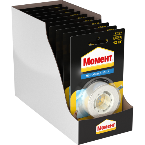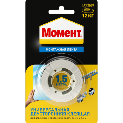 Лента Момент монтажная - двусторонняя клеящая лента с высокой адгезией, имеет хорошую начальную липкость, разработана для внутренних и наружных работ. Состав: вспененный полиэтилен, синтетический каучук. Область применения: хорошая адгезия к стеклу, плитке, дереву, металлу, кирпичу, камню, различным видам пластмасс (адгезия меньше к полиэтилену и полипропилену; при отрывании ленты возможно повреждение чувствительных поверхностей). Не рекомендуется для: тефлоновых поверхностей, силиконовых поверхностей, виниловых или бумажных обоев. Рекомендуется проверить адгезию ленты на незаметном участке. Не рекомендуется применять в местах, подверженных постоянному воздействию влаги и воды. Рулон выдерживает до 120 кг. Особенности: ширина 19 мм, длина: 1,5 м.