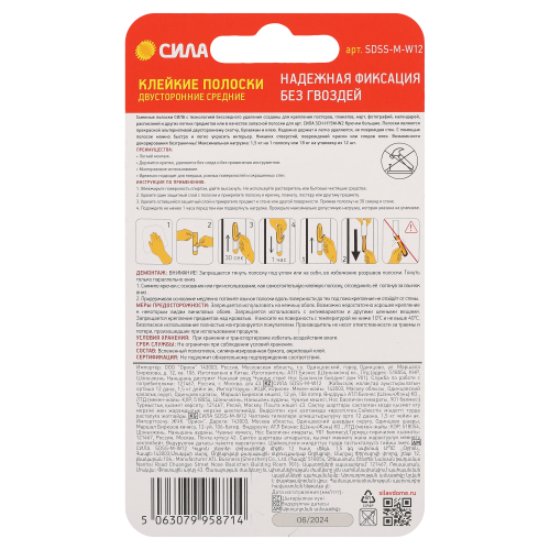 Сменные полоски СИЛА с технологией бесследного удаления созданы для крепления постеров, плакатов, карт, фотографий, календарей, расписаний и других легких предметов или в качестве запасной полоски для арт. Крючки большие СИЛА SCH-H15M-W2. Полоски являются прекрасной альтернативой двустороннему скотчу, булавкам и клею. Надежно держат и легко удаляются, не повреждая стен. С помощью полосок можно быстро и легко украсить интерьер. Никаких отверстий, повреждений краски или следов клея. Возможности декорирования безграничны! Максимальная нагрузка: 1,5 кг на 1 полоску или 18 кг на упаковку из 12 шт.