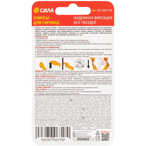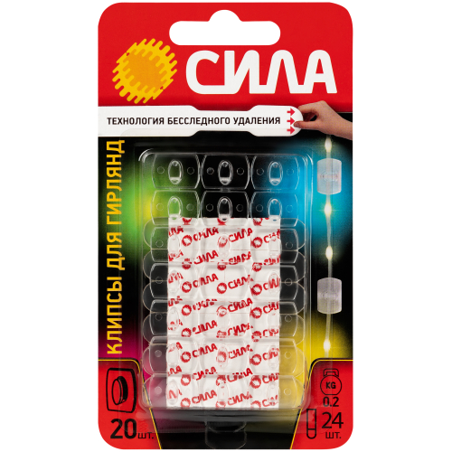 Клипсы для гирлянд СИЛА с технологией бесследного удаления предназначены для крепления гирлянд, мелкого декора и проводов. Прозрачные крепления помогут незаметно подчеркнуть декор вашего интерьера. При необходимости клипсы можно удалить, потянув за клейкую полоску. Клипсы можно использовать повторно со сменными полосками. Максимальная нагрузка: 200 г. Подходят для проводов диаметром до 2 мм.