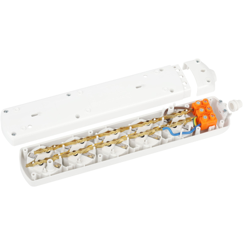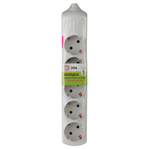 Колодка электрическая Эра K-5e с заземлением, 5 розеток. Корпус выполнен из ударопрочного и негорючего пластика. Рассчитана на максимальную мощность 16А / 3500 Вт и для подключения кабеля сечением до 1,5мм2. Электрическая колодка подойдет для тех, кто хочет сделать удлинитель самостоятельно. Также может использоваться как накладные розеточные блоке в подсобных помещениях.