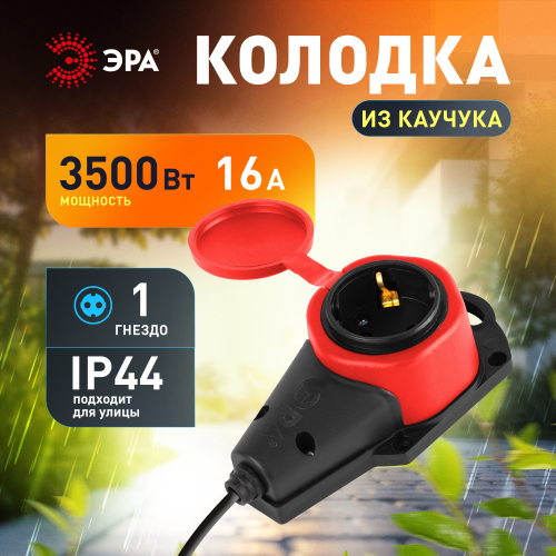 Каучуковая колодка ЭРА KX-1e-RED-IP44 1 гнездо, с заземлением, красная, для подключения кабеля (без разбора корпуса). Съёмная крышка. IP44-защита от пыли и влаги. Максимальная мощность 16А/3500Вт. Для кабеля сечением до 3x2,5мм2.