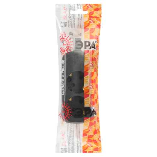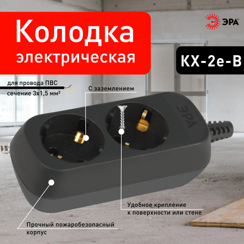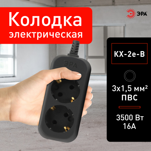 Колодка ЭРА KX-2e-B на 2 розетки, с заземлением, черная. Максимальная мощность - 16 А/3500 Вт. Для кабеля до 3х1,5мм2
