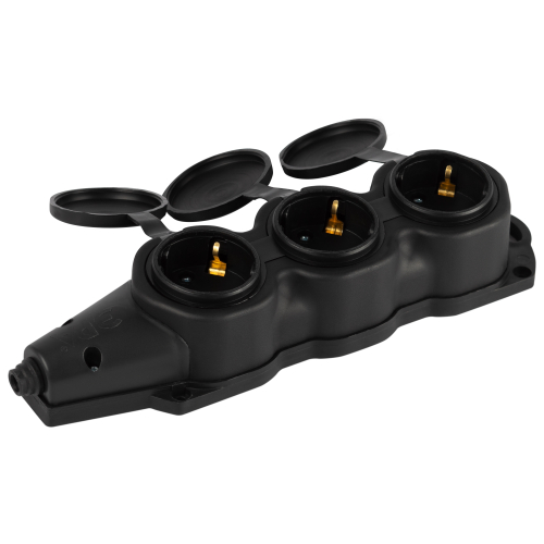 Каучуковая колодка ЭРА KX-3e-B-IP44 3 гнезда, с заземлением, черная, для подключения кабеля (без разбора корпуса). Съёмная крышка. IP44-защита от пыли и влаги. Максимальная мощность 16А/3500Вт. Для кабеля сечением до 3x2,5мм2.