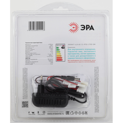 ЭРА Комплект светодиодной ленты 2835kit-4,8-60-12-IP20-2700-5m (50/1200) со степенью защиты от пыли и влаги IP20 - современный способ создания внутреннего освещения, подсветки ниш, лестничного пространства, систем хранения, а также декоративного и художественного оформления любых объектов и форм в помещениях.