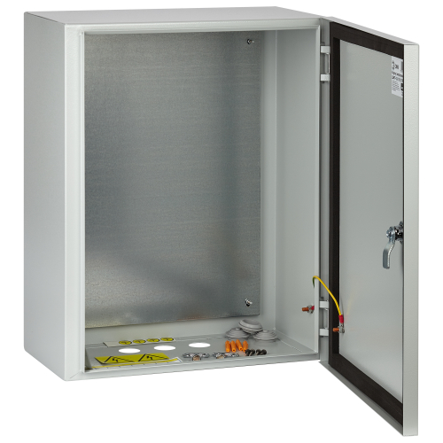 • Замок + 2 ключа; • Заземляющий проводник для дверцы; • Знаки электробезопасности; • Монтажный комплект; • Паспорт изделия; • Сальники для ввода кабеля (для шкафов с IP54);