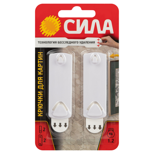 Крючок для картин СИЛА с технологией бесследного удаления предназначен для крепления рамок с твердой или верёвочной петлёй. При необходимости крючок можно удалить, потянув за клейкую полоску. Крючок можно использовать повторно со сменной полоской. Максимальная нагрузка: 1,2 кг.
