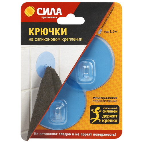 Эффективные крючки на силиконовом креплении СИЛА SH68-R2BTR-24. Набор из 2 самоклеящихся полупрозрачных крючков голубого оттенка. Форма основания - круглая, диаметр - 6,8 см. Удачный способ избежать сверления стен или мебели. Инновационные крючки на композитной силиконовой основе надежно удерживают предметы весом до 1,5 кг. Доступно многоразовое переклеивание с сохранением функций. Не портят поверхность и не оставляют следов. Идеальны для кафеля, пластика, стекла, ламинированных поверхностей. С успехом применяются во влажных помещениях - ванные комнаты, туалеты, кухни. Хорошее решение для подсобок, кладовых, гардеробных, прихожих. Полупрозрачные крючки-держатели отлично впишутся в интерьер, помогут грамотно организовать даже небольшое по площади пространство. Активно используются как крючки для полотенец, крючки для проводов, крючки для гирлянд.