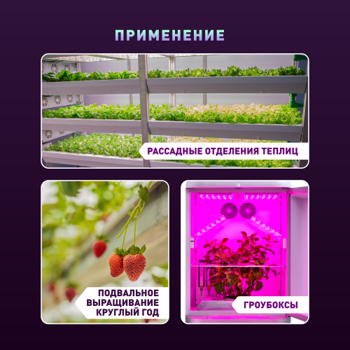 276 светодиодов для мощной досветки растений! Мощность - 160 Вт. Энергоэффективность этой подвесной LED-панели для бытового использования соответствует нормативам тепличных хозяйств (ГОСТ 57671 - 2017). Применяться такой мощный фитопрожектор может очень широко - досветка рассады в квартирах, рассадные отделения теплиц, круглогодичное подвальное выращивание, гроубоксы. Может работать как единственный источник света для растений в полностью затемнённых помещениях. Свечение полного спектра подходит для всех стадий роста растения: прорастание, вегетация, цветение, плодоношение. Применены диоды Samsung.