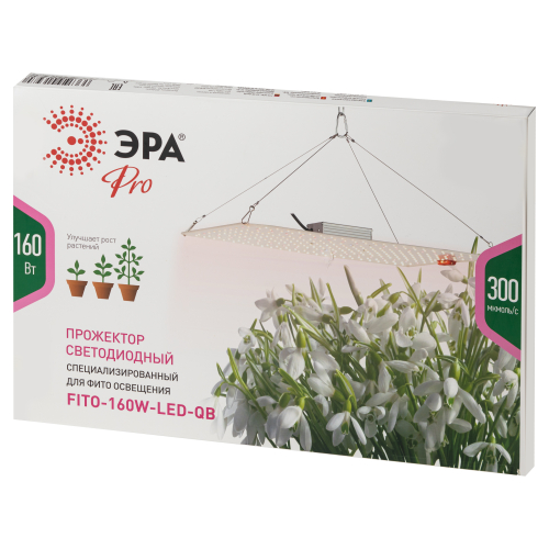 ЭРА FITO-160W-LED-QB - это полный комплект для организации фитоосвещения: светодиодная панель Quantum Board, надёжный металлический блок питания (выключатель на проводе, вилка), карабин с узлом регулировки высоты подвеса (до 2 метров), карабин с тросовым креплением.