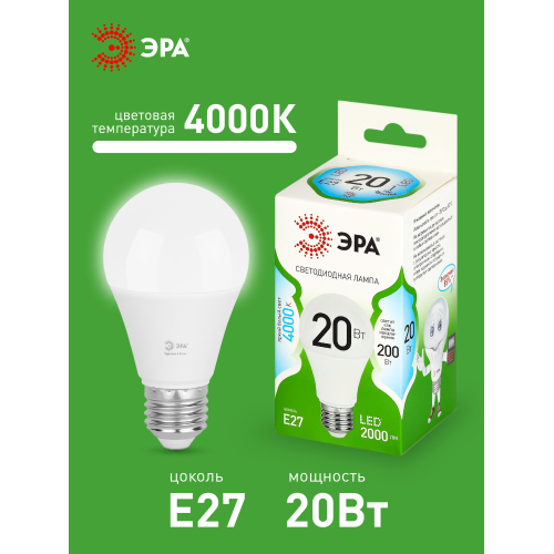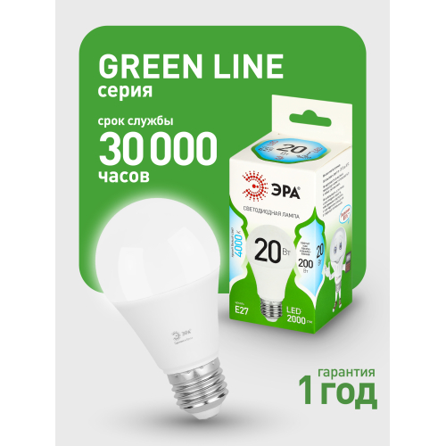 Светодиодная лампа ЭРА LED A60-20W-840-E27 GL серии Green Line — эффективное решение для основного освещения. Лампочка Е27 мощностью 20 Вт излучает нейтральный белый свет (4000K) без мерцания. Классическая колба A60 (груша) и стандартный цоколь E27 делают её совместимой с люстрами, бра, настольными и напольными светильниками. Высота лампы: 108 мм. Светодиоды потребляют меньше электроэнергии и служат значительно дольше традиционных ламп накаливания: до 30 000 часов. Работает от сети 220 В, эквивалентна 80 Вт лампе накаливания. Светодиодные лампы ЭРА подходят для жилых и коммерческих помещений и обеспечивают стабильное освещение.