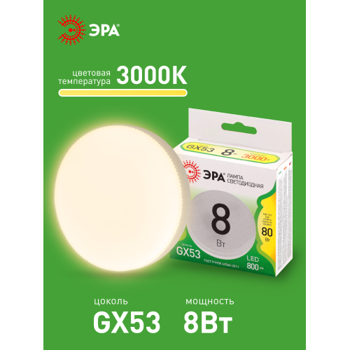 Светодиодная лампа ЭРА LED GX-8W-830-GX53 GL серии Green Line — современный и экономичный аналог лампы накаливания. Лампочка с цоколем GX53 и мощностью 8 Вт излучает теплый белый свет (3000K), создавая комфортное освещение. Плоская форма плафона и универсальный размер 75 мм позволяют использовать её в потолочных светильниках, настенных бра и мебельной подсветке. Такая светодиодная лампа подойдет для дома, офисов, магазинов и гостиниц. Потребляет минимум энергии, не нагревается и служит значительно дольше традиционных ламп накаливания. Работает от сети 220 В, эквивалентна 80 Вт лампе накаливания.