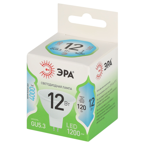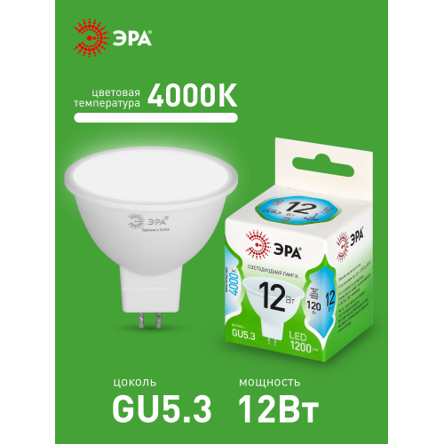 Светодиодная лампа ЭРА LED MR16-12W-840-GU5.3 GL серии Green Line — современный и энергоэффективный источник света. Лампочка мощностью 12 Вт с цоколем GU5.3 излучает нейтральный белый свет (4000K) без мерцания. Форма MR16 с отражателем обеспечивает направленный световой поток и идеально подходит для акцентного и основного освещения: в точечных светильниках, трековых системах, витринах и подвесных конструкциях. Потребляет минимум энергии, не нагревается, устойчива к перепадам напряжения и обеспечивает стабильное свечение. Работает от сети 220 В, эквивалентна 120 Вт лампе накаливания. Отличное решение для дома, офисов, магазинов, кафе и гостиниц.