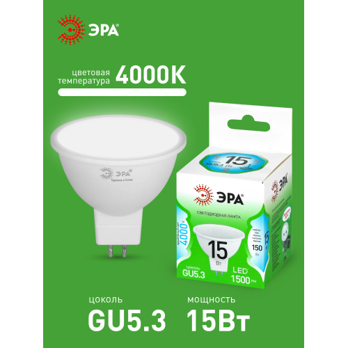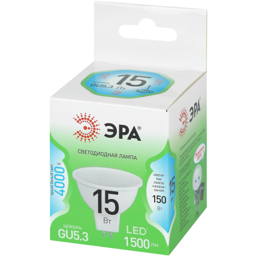 Светодиодная лампа ЭРА LED MR16-15W-840-GU5.3 GL серии Green Line — современный и энергоэффективный источник света. Лампочка мощностью 15 Вт с цоколем GU5.3 излучает нейтральный белый свет (4000K) без мерцания. Форма MR16 с отражателем обеспечивает направленный световой поток и идеально подходит для акцентного и основного освещения: в точечных светильниках, трековых системах, витринах и подвесных конструкциях. Потребляет минимум энергии, не нагревается, устойчива к перепадам напряжения и обеспечивает стабильное свечение. Работает от сети 220 В, эквивалентна 150 Вт лампе накаливания. Отличное решение для дома, офисов, магазинов, кафе и гостиниц
