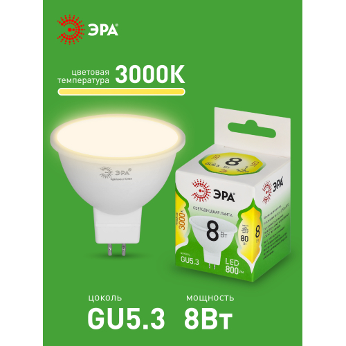 Светодиодная лампа ЭРА LED MR16-8W-830-GU5.3 GL серии Green Line — современный и энергоэффективный источник света. Лампочка мощностью 8 Вт с цоколем GU5.3 излучает теплый белый свет (3000K) без мерцания. Форма MR16 с отражателем обеспечивает направленный световой поток и идеально подходит для акцентного и основного освещения: в точечных светильниках, трековых системах, витринах и подвесных конструкциях. Потребляет минимум энергии, не нагревается, устойчива к перепадам напряжения и обеспечивает стабильное свечение. Работает от сети 220 В, эквивалентна 80 Вт лампе накаливания. Отличное решение для дома, офисов, магазинов, кафе и гостиниц.