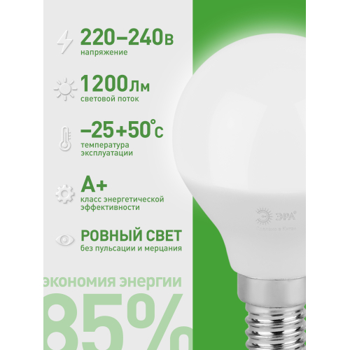 Светодиодная лампа ЭРА LED P45-12W-840-E14 GL серии Green Line — компактный и энергоэффективный источник света. Лампочка мощностью 12 Вт с цоколем E14 излучает нейтральный белый свет (4000K), создавая комфортное и равномерное освещение. Высота лампы: 80 мм. Форма P45 (шар) и небольшой размер делают её отличным выбором для настольных ламп, бра, торшеров и декоративных светильников. Отличается низким энергопотреблением, долгим сроком службы и устойчивостью к перепадам напряжения. Работает от сети 220 В, эквивалентна 120 Вт лампе накаливания. Обеспечивает стабильное свечение без мерцания, идеально подходит для дома, гостиниц, кафе и коммерческих помещений.