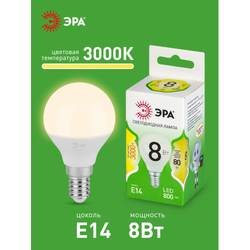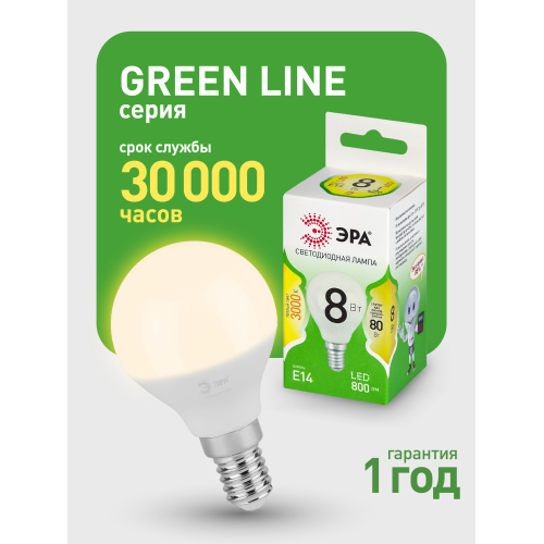 Светодиодная лампа ЭРА LED P45-8W-830-E14 GL серии Green Line — компактный и энергоэффективный источник света. Лампочка мощностью 8 Вт с цоколем E14 излучает теплый белый свет (3000K), создавая комфортное и равномерное освещение. Высота лампы: 80 мм. Форма P45 (шар) и небольшой размер делают её отличным выбором для настольных ламп, бра, торшеров и декоративных светильников. Отличается низким энергопотреблением, долгим сроком службы и устойчивостью к перепадам напряжения. Работает от сети 220 В, эквивалентна 80 Вт лампе накаливания. Обеспечивает стабильное свечение без мерцания, идеально подходит для дома, гостиниц, кафе и коммерческих помещений.