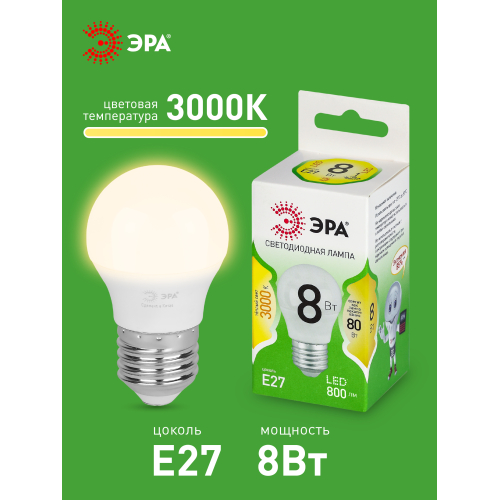 Светодиодная лампа ЭРА LED P45-8W-830-E27 GL серии Green Line — компактный и энергоэффективный источник света. Лампочка мощностью 8 Вт с цоколем E27 излучает теплый белый свет (3000K), создавая комфортное и равномерное освещение. Высота лампы: 80 мм. Форма P45 (шар) и небольшой размер делают её отличным выбором для настольных ламп, бра, торшеров и декоративных светильников. Отличается низким энергопотреблением, долгим сроком службы и устойчивостью к перепадам напряжения. Работает от сети 220 В, эквивалентна 80 Вт лампе накаливания. Обеспечивает стабильное свечение без мерцания, идеально подходит для дома, гостиниц, кафе и коммерческих помещений.