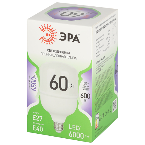Светодиодная лампа ЭРА LED POWER T100-60W-865-E27/E40 GL серии Green Line — универсальный и энергоэффективный источник света. В комплекте предусмотрен сменный цоколь Е40, что позволяет использовать лампочку в различных помещениях. Цветовая температура 6500К излучает холодный белый свет без мерцаний. Высота лампы: 165 мм. Плафон в форме колокола обеспечивает равномерное распределение света. Лампочка ЭРА Е27 отличается низким энергопотреблением, долгим сроком службы и устойчивостью к перепадам напряжения. Работает от сети 220 В, эквивалентна 600 Вт лампе накаливания. Подходит для освещения жилых помещений, офисов, магазинов и производственных площадей.