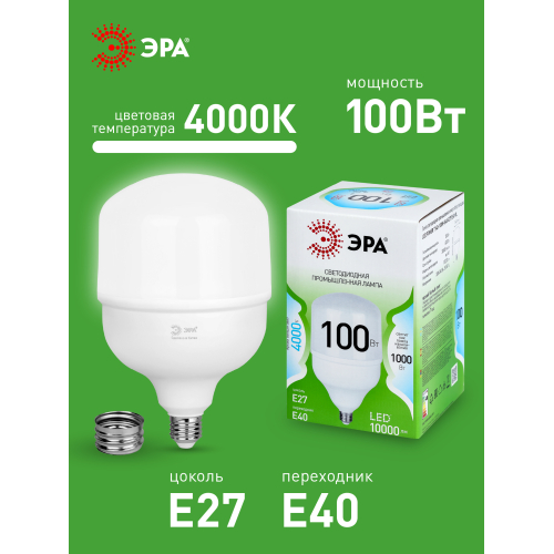 Светодиодная лампа ЭРА LED POWER T140-100W-840-E27/E40 GL серии Green Line — универсальный и энергоэффективный источник света. В комплекте предусмотрен сменный цоколь Е40, что позволяет использовать лампочку в различных помещениях. Цветовая температура 4000К излучает нейтральный белый свет без мерцаний. Высота лампы: 225 мм. Плафон в форме колокола обеспечивает равномерное распределение света. Лампочка ЭРА Е27 отличается низким энергопотреблением, долгим сроком службы и устойчивостью к перепадам напряжения. Работает от сети 220 В, эквивалентна 1000 Вт лампе накаливания. Подходит для освещения жилых помещений, офисов, магазинов и производственных площадей.