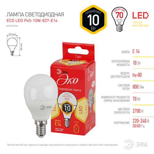 Бытовая светодиодная лампа ЭРА Серии Бюджет, создаёт яркое ровное освещение и экономит до 90% электроэнергии по сравнению с лампой накаливания с аналогичным световым потоком. Светит теплым светом с жёлтым оттенком - такая цветовая температура эффективна для отдыха и уютной атмосферы в доме. Используется в потолочных, настенных, настольных светильниках, в люстрах и бра. Мгновенно включается и не нагревается.
