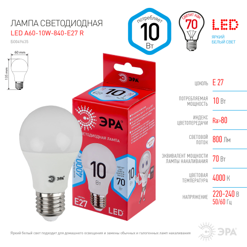 Эта светодиодная лампа ЭРА Серии Бюджет - современный, качественный и доступный источник света. Позволяет экономить до 90% электроэнергии по сравнению с лампой накаливания с аналогичным световым потоком. Светит ярким белым светом, который максимально приближен к естественному дневному. Идеальна для ежедневного применения в быту. Мгновенное включение. Ровное освещение. Можно использовать как с люстрами, так и со светильниками, в том числе настольными и бра.
