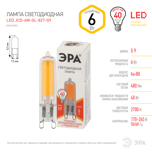 Светодиодные лампы капсульные ЭРА с цоколем G9 идеальны для акцентной подсветки и декоративного освещения. Выполнены в стекле со светодиодом типа СOB