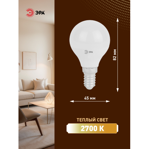 Бытовая светодиодная лампа ЭРА Серии Стандарт, создаёт яркое ровное освещение и экономит до 90% электроэнергии по сравнению с лампой накаливания с аналогичным световым потоком. Светит теплым светом с жёлтым оттенком - такая цветовая температура эффективна для отдыха и уютной атмосферы в доме. Используется в потолочных, настенных, настольных светильниках, в люстрах и бра. Мгновенно включается и не нагревается.