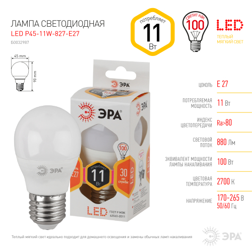 Бытовая светодиодная лампа ЭРА Серии Стандарт, создаёт яркое ровное освещение и экономит до 90% электроэнергии по сравнению с лампой накаливания с аналогичным световым потоком. Светит теплым светом с жёлтым оттенком - такая цветовая температура эффективна для отдыха и уютной атмосферы в доме. Используется в потолочных, настенных, настольных светильниках, в люстрах и бра. Мгновенно включается и не нагревается.