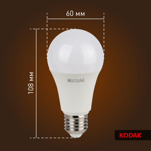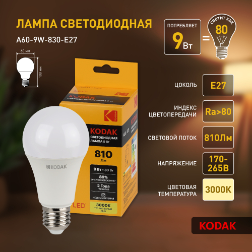 Представляем Вашему вниманию новинку от легендарного бренда Kodak - светодиодные лампочки, которые украсят Ваш интерьер и наполнят дом светом! Лампы всемирно известной марки отличаются традиционно высоким качеством, продолжительным сроком службы, эксплуатационной надежностью, и, конечно, доступной ценой. LED KODAK A60-9W-830-E27 - лампочка с цоколем E27, отлично подойдет для самых разных целей: ее можно установить в люстру или светильник на кухне, в спальне, детской комнате или коридоре. Мощность лампы составляет 9Вт, эквивалент лампе накаливания - 80Вт. Цветовая температура - 3000К - теплый свет, подобный к свечению ламп накаливания. Такой свет идеально подойдет для спальни или детской комнаты, благодаря теплому свету помещение наполнится атмосферой тепла и уюта. Диаметр лампочки составляет 60мм, а высота - 108мм. Корпус устройств выполнен из высококачественных алюминия и термо пластика, что делает использование источников света абсолютно безопасным. Невозможно оставить без внимания неоспоримые преимущества технологии, в которой выполнены лампы: LED (светодиоды KODAK). В первую очередь, это высокая светоотдача и низкое энергопотребление: эти источники света тратят в 10 раз меньше, чем лампы накаливания. Срок службы - 35000 часов - более чем 3,5 года постоянного свечения. Еще одно преимущество - светодиоды не содержат в себе ртути и прочих вредных металлов. Купив лампу от Kodak, Вы сможете быть уверены в высоком качестве продукта и безопасности своих близких.