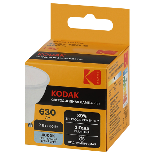 Представляем Вашему вниманию новинку от легендарного бренда Kodak - светодиодные лампочки, которые украсят Ваш интерьер и наполнят дом светом! Лампы всемирно известной марки отличаются традиционно высоким качеством, продолжительным сроком службы, эксплуатационной надежностью, и, конечно, доступной ценой. LED KODAK MR16-7W-840-GU10 - лампочка с цоколем GU10, отлично подойдет для самых разных целей: ее можно установить в люстру или светильник на кухне, в спальне, детской комнате или коридоре. Мощность лампы составляет 7Вт, эквивалент лампе накаливания - 60Вт. Цветовая температура - 4000К - нейтральный белый свет, похожий на дневной. Такой свет идеально подойдет для комфортного пребывания в помещении, лампу можно использовать как для жилых, так и для рабочих зон. Диаметр лампочки составляет 50мм, а высота - 56мм. Корпус устройств выполнен из высококачественных алюминия и термо пластика, что делает использование источников света абсолютно безопасным. Невозможно оставить без внимания неоспоримые преимущества технологии, в которой выполнены лампы: LED (светодиоды KODAK). В первую очередь, это высокая светоотдача и низкое энергопотребление: эти источники света тратят в 10 раз меньше, чем лампы накаливания. Срок службы - 35000 часов - более чем 3,5 года постоянного свечения. Еще одно преимущество - светодиоды не содержат в себе ртути и прочих вредных металлов. Купив лампу от Kodak, Вы сможете быть уверены в высоком качестве продукта и безопасности своих близких.