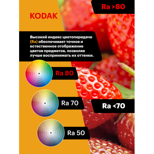 Представляем Вашему вниманию новинку от легендарного бренда Kodak - светодиодные лампочки, которые украсят Ваш интерьер и наполнят дом светом! Лампы всемирно известной марки отличаются традиционно высоким качеством, продолжительным сроком службы, эксплуатационной надежностью, и, конечно, доступной ценой. LED KODAK MR16-7W-865-GU5.3 - лампочка с цоколем GU5.3, отлично подойдет для самых разных целей: ее можно установить в люстру или светильник на кухне, в спальне, детской комнате или коридоре. Мощность лампы составляет 7Вт, эквивалент лампе накаливания - 60Вт. Цветовая температура - 6500К - ярчайший белый свет, слегка уходящий в голубой спектр. Такой свет идеально подойдет для помещений, где требуется высокая концентрация и продуктивный настрой. Диаметр лампочки составляет 50мм, а высота - 48мм. Корпус устройств выполнен из высококачественных алюминия и термо пластика, что делает использование источников света абсолютно безопасным. Невозможно оставить без внимания неоспоримые преимущества технологии, в которой выполнены лампы: LED (светодиоды KODAK). В первую очередь, это высокая светоотдача и низкое энергопотребление: эти источники света тратят в 10 раз меньше, чем лампы накаливания. Срок службы - 35000 часов - более чем 3,5 года постоянного свечения. Еще одно преимущество - светодиоды не содержат в себе ртути и прочих вредных металлов. Купив лампу от Kodak, Вы сможете быть уверены в высоком качестве продукта и безопасности своих близких.