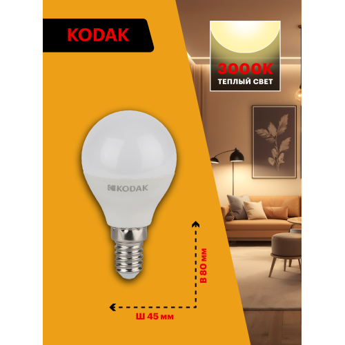 Представляем Вашему вниманию новинку от легендарного бренда Kodak - светодиодные лампочки, которые украсят Ваш интерьер и наполнят дом светом! Лампы всемирно известной марки отличаются традиционно высоким качеством, продолжительным сроком службы, эксплуатационной надежностью, и, конечно, доступной ценой. LED KODAK P45-7W-830-E14 - лампочка с цоколем E14, отлично подойдет для самых разных целей: ее можно установить в люстру или светильник на кухне, в спальне, детской комнате или коридоре. Мощность лампы составляет 7Вт, эквивалент лампе накаливания - 60Вт. Цветовая температура - 3000К - теплый свет, подобный к свечению ламп накаливания. Такой свет идеально подойдет для спальни или детской комнаты, благодаря теплому свету помещение наполнится атмосферой тепла и уюта. Диаметр лампочки составляет 45мм, а высота - 80мм. Корпус устройств выполнен из высококачественных алюминия и термо пластика, что делает использование источников света абсолютно безопасным. Невозможно оставить без внимания неоспоримые преимущества технологии, в которой выполнены лампы: LED (светодиоды KODAK). В первую очередь, это высокая светоотдача и низкое энергопотребление: эти источники света тратят в 10 раз меньше, чем лампы накаливания. Срок службы - 35000 часов - более чем 3,5 года постоянного свечения. Еще одно преимущество - светодиоды не содержат в себе ртути и прочих вредных металлов. Купив лампу от Kodak, Вы сможете быть уверены в высоком качестве продукта и безопасности своих близких.
