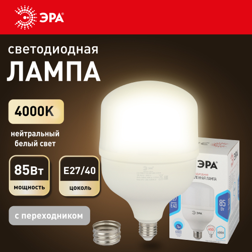 Светодиодная лампа ЭРА LED POWER T140-85W-4000-E27/E40 с большой мощностью - 85 Вт, аналог лампы накаливания 650 Вт. Экономит до 90% электроэнергии. Эффективна для освещения производственных, торговых, складских, выставочных помещений. Отличается грамотно продуманной системой охлаждения. Светит нейтральным белым светом. Светоотдача - 6800 Лм. Срок службы - 30 лет. Гарантия - 2 года. В комплекте специальный проводник, который позволяет использовать лампу с патроном E27 или E40.