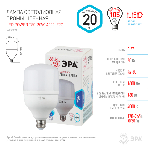 Светодиодная лампа повышенной мощности ЭРА LED POWER T80-20W-4000-E27 идеальна для качественного и экономичного освещения пространств с большой площадью производственных, торговых, выставочных, складских, подсобных помещений. Светит ярко, как лампа накаливания 160 Вт, при этом потребляет мощность всего 20 Вт. Экономит до 90% электроэнергии. Создаёт комфортное для глаз освещение нейтрального белого цвета. Не нагревается, включается мгновенно, не мигает. Размеры: 144 х 80 мм.