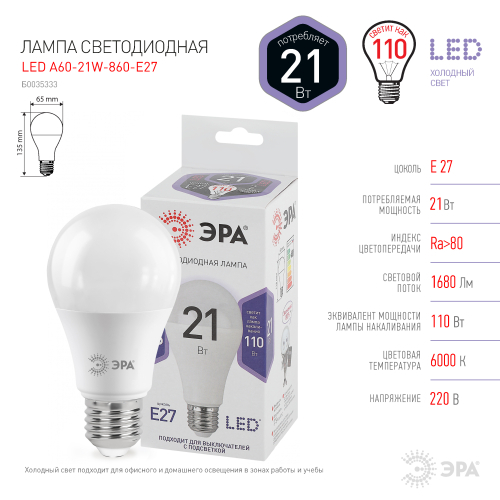 Экономичная светодиодная лампа ЭРА Серии Стандарт с отличными характеристиками для установки в люстры и все типы бытовых светильников - потолочные, настольные, бра. Бережёт электроэнергию, ярко светит, имеет долгий срок службы. Цветовая температура - холодный белый свет. Такое освещение бодрит, повышает работоспособность. Этот современный источник света создаёт комфортное и безопасное для глаз освещение.