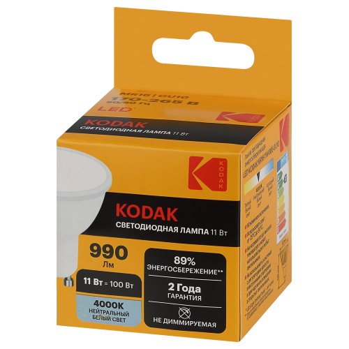 Представляем Вашему вниманию новинку от легендарного бренда Kodak - светодиодные лампочки, которые украсят Ваш интерьер и наполнят дом светом! Лампы всемирно известной марки отличаются традиционно высоким качеством, продолжительным сроком службы, эксплуатационной надежностью, и, конечно, доступной ценой. LED KODAK MR16-11W-840-GU10 - лампочка с цоколем GU10, отлично подойдет для самых разных целей: ее можно установить в люстру или светильник на кухне, в спальне, детской комнате или коридоре. Мощность лампы составляет 11Вт, эквивалент лампе накаливания - 100Вт. Цветовая температура - 4000К - нейтральный белый свет, похожий на дневной. Такой свет идеально подойдет для комфортного пребывания в помещении, лампу можно использовать как для жилых, так и для рабочих зон. Диаметр лампочки составляет 50мм, а высота - 56мм. Корпус устройств выполнен из высококачественных алюминия и термо пластика, что делает использование источников света абсолютно безопасным. Невозможно оставить без внимания неоспоримые преимущества технологии, в которой выполнены лампы: LED (светодиоды KODAK). В первую очередь, это высокая светоотдача и низкое энергопотребление: эти источники света тратят в 10 раз меньше, чем лампы накаливания. Срок службы - 35000 часов - более чем 3,5 года постоянного свечения. Еще одно преимущество - светодиоды не содержат в себе ртути и прочих вредных металлов. Купив лампу от Kodak, Вы сможете быть уверены в высоком качестве продукта и безопасности своих близких.