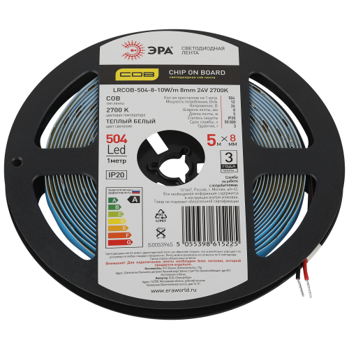 Лента светодиодная ЭРА LRCOB-504-8 10W/m 8mm 24V 2700K 3year белая 5 м со степенью защиты от пыли и влаги IP20 - современный способ создания внутреннего освещения, подсветки ниш, лестничного пространства, систем хранения, а также декоративного и художественного оформления любых объектов и форм в помещениях. Светодиодная СОВ лента сплошной засветки без видимых светодиодов. Легко и быстро устанавливается на любой гладкой поверхности с помощью скотча, расположенного на оборотной стороне ленты Используя алюминиевый профиль, можно создавать необычные и функциональные решения освещения в Вашем интерьере. Рабочее напряжение ленты составляет 24В, а мощность равна 10 Вт/м. Светодиодная лента обладает световым потоком 850 Лм/м, и цветом свечения - теплый белый (2700 K)