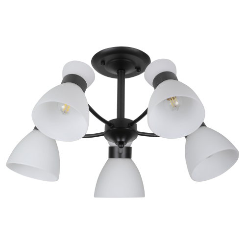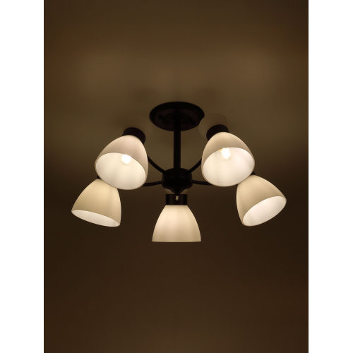 Серия чёрных светильников с опаловыми плафонами — стильное и функциональное решение для современного интерьера. В коллекции люстры на 5 и 8 ламп, а также бра с удобным выключателем-цепочкой. Подходят лампы с цоколем E27, мощностью до 60 Вт (лампы в комплект не входят).