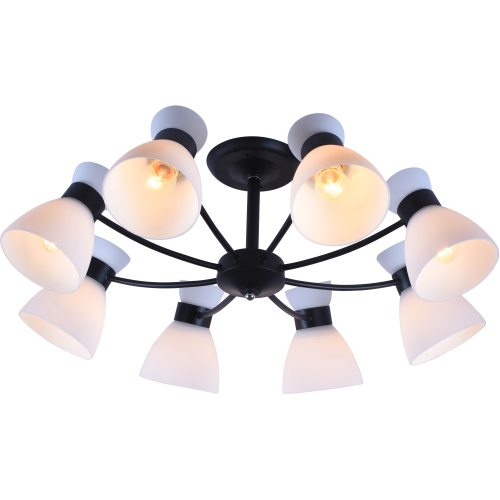 Серия чёрных светильников с опаловыми плафонами — стильное и функциональное решение для современного интерьера. В коллекции люстры на 5 и 8 ламп, а также бра с удобным выключателем-цепочкой. Подходят лампы с цоколем E27, мощностью до 60 Вт (лампы в комплект не входят).