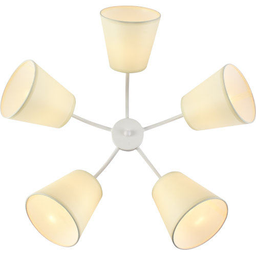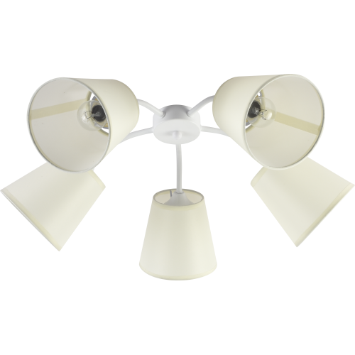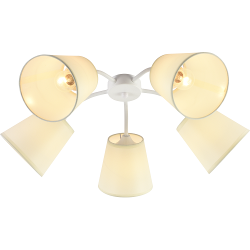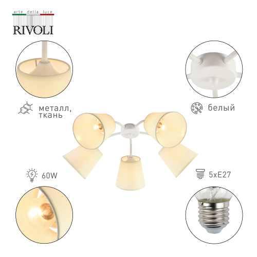 5-рожковая белая люстра с тканевыми плафонами в виде абажуров, направленных в разные стороны - Rivoli Aimee (арт. 9162-305). Коллекция Aimee итальянского бренда Rivoli – это белые лаконичные люстры классического дизайна. К заказу доступна также люстра с 3 плафонами – арт. 9162-303. Источники света, подходящие к данным люстрам потолочным – Е27 60 Вт.