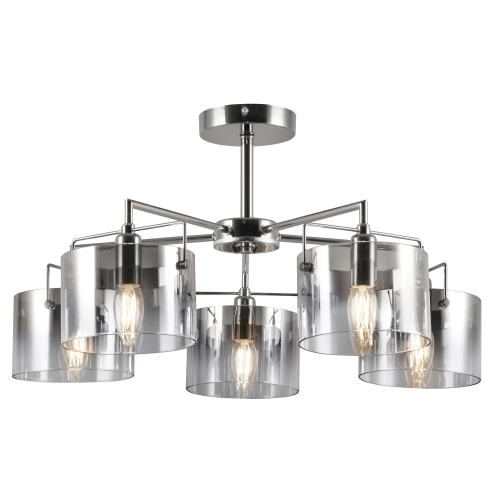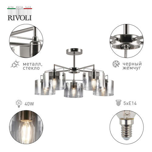 Основу коллекции Rivoli Bonnie составляют люстры под 5 и 7 ламп (арт. 2078-305 и 2078-307). Люстры и бра (арт. 2078-401) Bonnie применяются с лампами Е14 40 Вт. Данная люстра потолочная на штанге имеет 5 стеклянных плафонов в форме абажуров. В сочетании с «телескопическими» рожками подчёркнутой геометрии это делает люстры потолочные Bonnie прекрасным решением для современных интерьеров – стиль и уют. Арматура люстры имеет стойкое гальваническое покрытие редкого цвета чёрный жемчуг. С этим оттенком гармонично сочетается дымчатое тонирование стекла люстры на потолок. Высота люстры со штангой – 310 мм. Короткая штанга позволяет успешно использовать эти люстры в стандартных жилых комнатах с невысокими потолками или потолками средней высоты.
