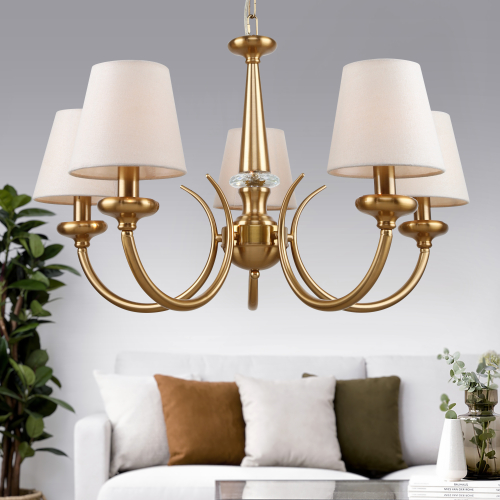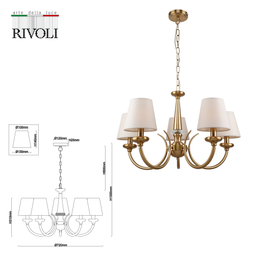 Rivoli Carissa – классическая люстра в современном воплощении. Коллекция Rivoli Carissa создана итальянскими дизайнерами. В неё входят 5-рожковые подвесные люстры (арт. 2073-305), люстры подвесные под 7 ламп (арт. 2073-307), бра (2073-401). Подвес люстр на потолок Carissa декорирован цепочкой, его длину можно отрегулировать при установке люстры. Отдавая дань традициям классического стиля, дизайнеры бренда Rivoli представили люстры Carissa в золотом цвете, с тканевыми плафонами-абажурами и хрустальным декором. Однако общий минимализм конструкции делает эти люстры потолочные удачным решением для любого современного интерьера. Данная люстра в гостиную или люстра в спальню качественно осветит до 15 м2 площади, в 5 плафонов необходимо купить лампы Е14 мощностью 40 Вт.