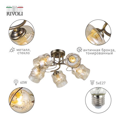 Rivoli Carmela (арт. 9080-305) - 5-рожковая люстра на потолок от итальянских дизайнеров. Выполненная в стиле модерн, эта элегантная современная люстра станет универсальным решением для любого интерьера. Аккуратная и красивая. Корпус люстры украшен тонкими металлическими "веточками". Люстры потолочные Carmela имеют 5 стеклянных фигурных плафонов теплой тонировки. Создают комфортное освещение в любой комнате - прекрасный вариант люстры на кухню, в гостиную, спальню. Мягко рассеивают свет, минимизируя блики.