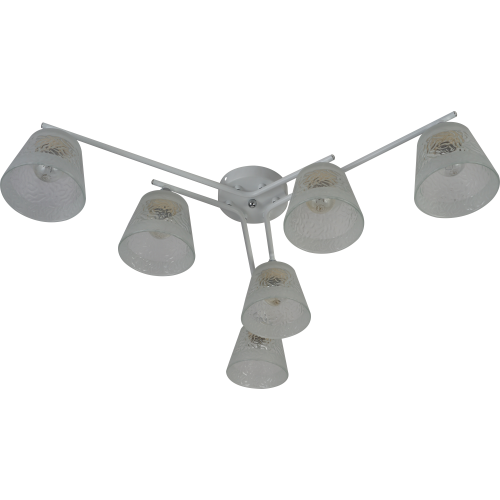 Люстра из металла Constance Rivoli качественно освещает площадь до 18 м2. Такая потолочная люстра хорошо смотрится в небольших жилых комнатах – люстра на кухню, люстра в спальню. Прозрачные стеклянные плафоны люстры имеют красивый рифлёный рисунок и декорированы матовыми полосами.